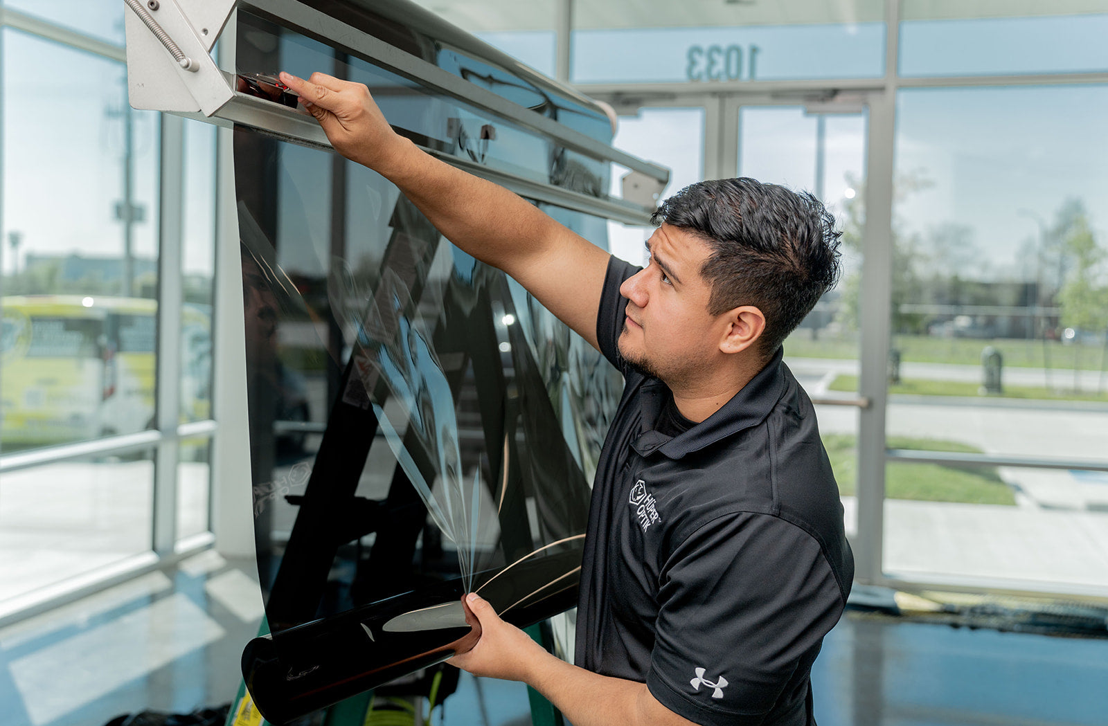 Next is installing the film and trimming the edges. Every piece of film is custom trimmed to size on the window, as every window can have slight alterations in the exact width and length. A custom trim by a certified technician ensures consistency throughout the perimeter of the Commercial window space.